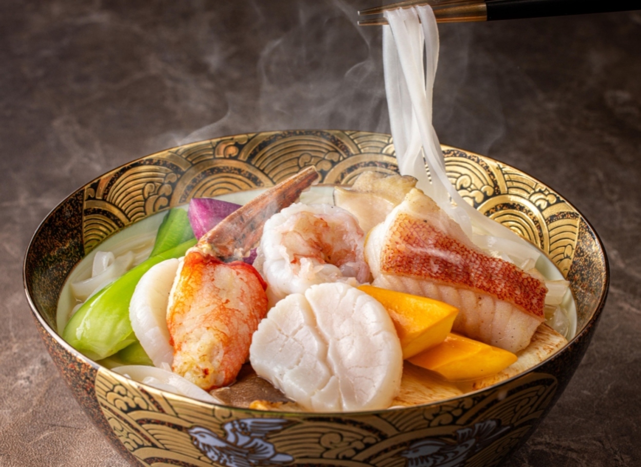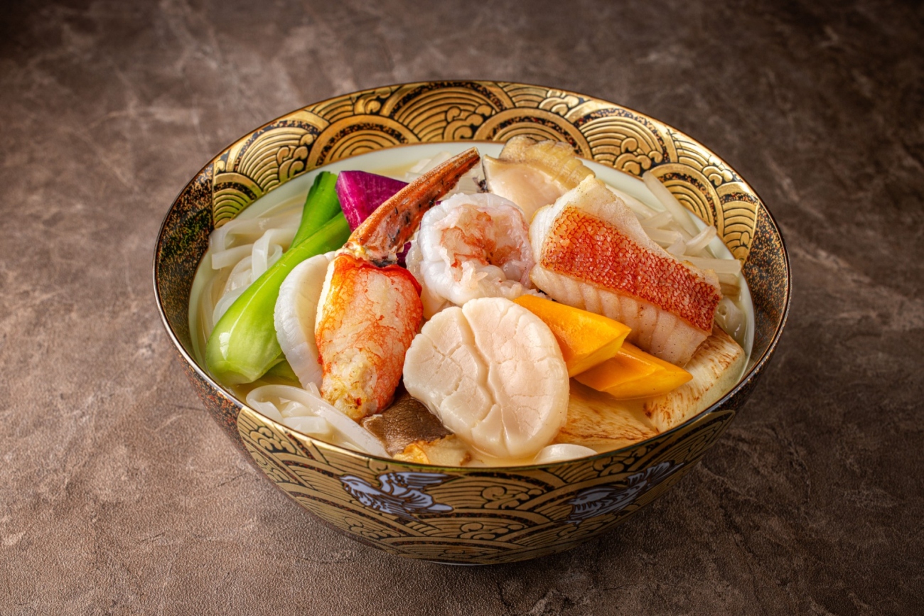 八ヶ岳麦芽赤鶏の芳醇な鶏出汁スープに、もっちりとした国産米粉の平打ち麺をあわせました。鮑、帆立など贅沢な海鮮と、契約農家「中台菜園」の新鮮な中国野菜が彩りと季節感を添えます。食材の彩りを引き立てる有田焼の専用器とともに、「彩龍」 南料理長ならではの広東スタイルをぜひご堪能ください。