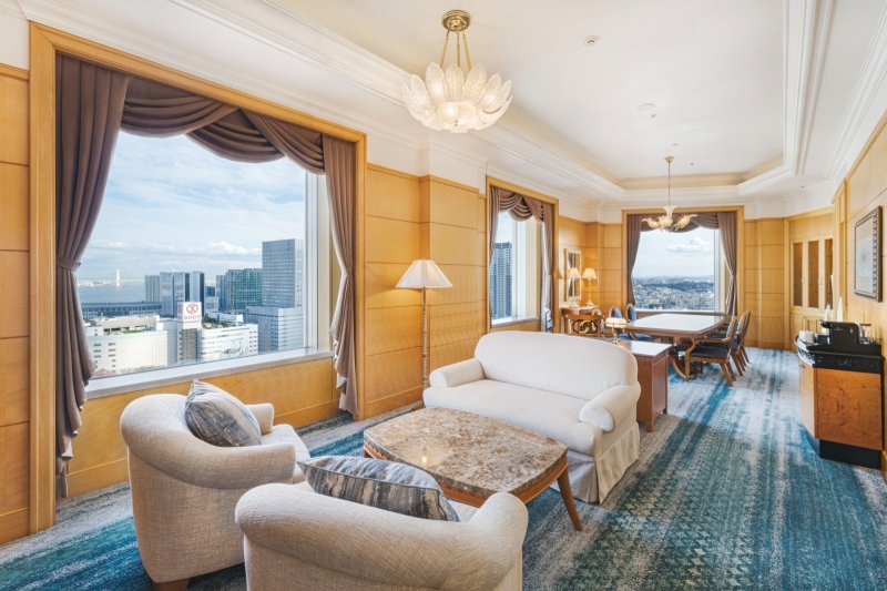 高層階に位置する広々としたエレガントな客室。暮らすように過ごせるダイニングと静かにくつろげるベッドルームで、横浜の景色を眺めながらゆったりとお過ごしいただけます。