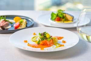 目には、皿の上に描かれた料理の彩り。横浜港の景色。